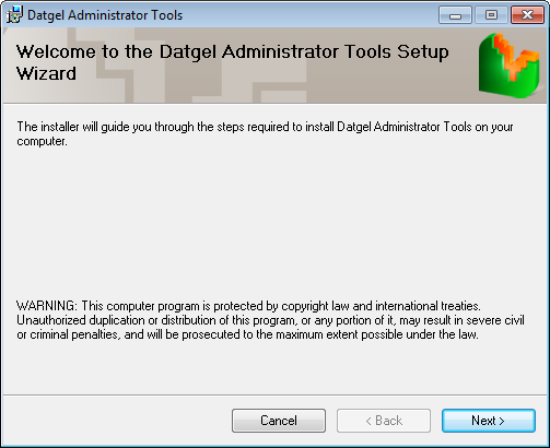 Follow the on screen instructions when installation begins. - Click Next on the Welcome to the Datgel Administrator Tools Setup Wizard dialog.