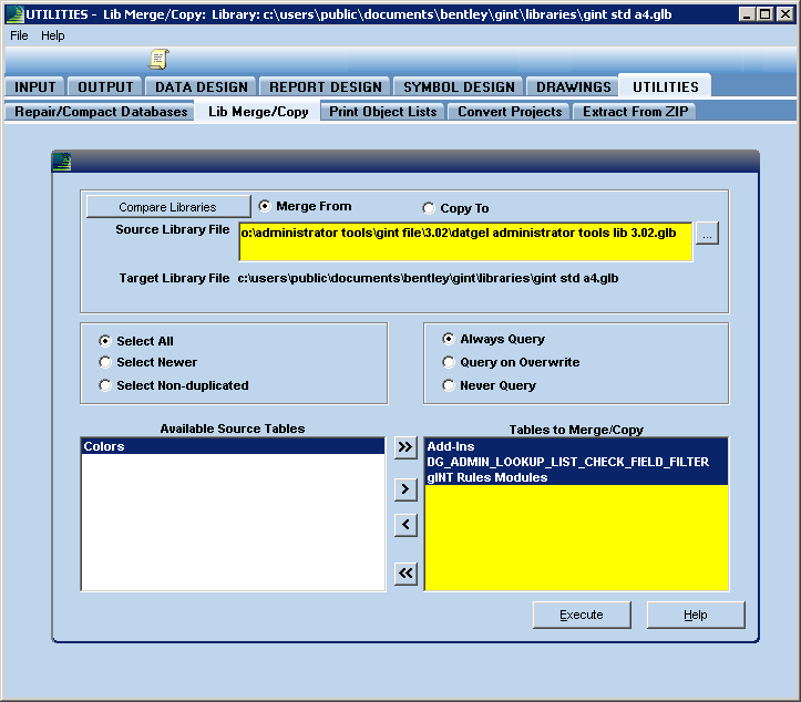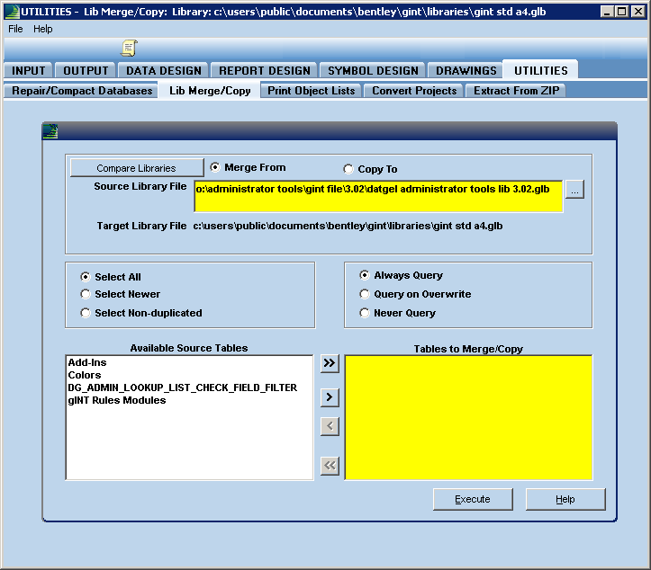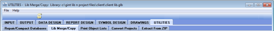 The opened project and library files are displayed at the top of the gINT Window. - Select UTILITIES | Lib Merge/Copy