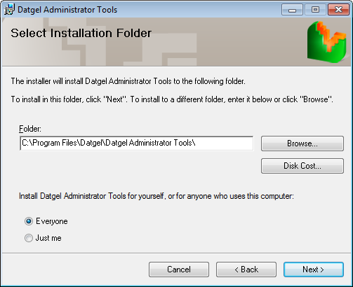 The EULA is deployed to C:\Program Files (x86)\Datgel\Datgel Administrator Tools\End User License Agreement.rtf. - On the Select Installation Folder dialog, either accept the default folder (recommended) or select Browse to specify the folder where you want to install the Administrator Tools.