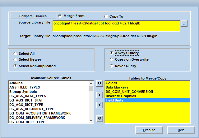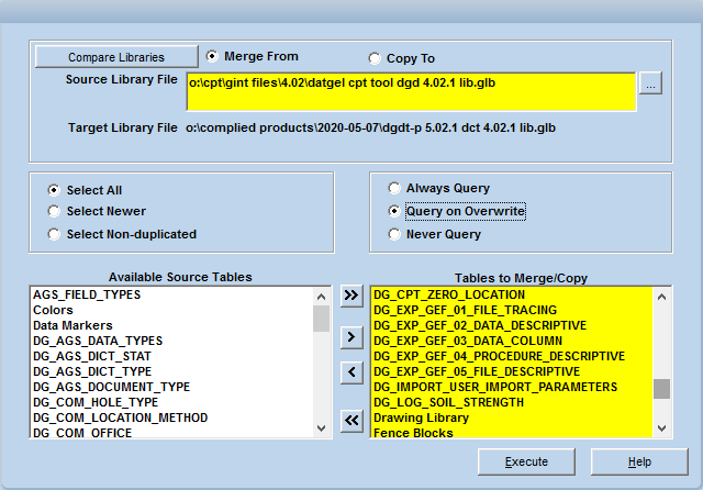 - Check the Query On Overwrite box, then move all source tables, except Material Composite Symbols and Tiles, to the yellow box on the right side by clicking the >> button. Critical CPT Tool library tables include all tables starting with DG_CPT*, and library tables DG_COM_UNIT_CONVERSION, DG_LOG_SOIL_STRENGTH, and DG_IMPORT_USER_IMPORT_PARAMETERS.