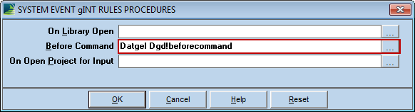 - In INPUT select gINT Rules > System Events... and place Datgel Dgd!beforecommand in the Before Command text box. (This can also be configured in DATA DESIGN | Library Data)