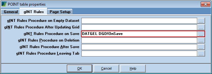 The DATA DESIGN | Project Database | Tools > Replace Field Names function will assist you to update the CPT library objects to use the fields and tables in your custom project file. - In DATA DESIGN | Project Database change the yellow object selector list to the POINT table, select Tables > Properties... move to the gINT Rules tab, and place DATGEL DGD!OnSave in the gINT Rules Procedure on Save text box. (This can also be configured in INPUT)