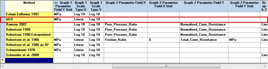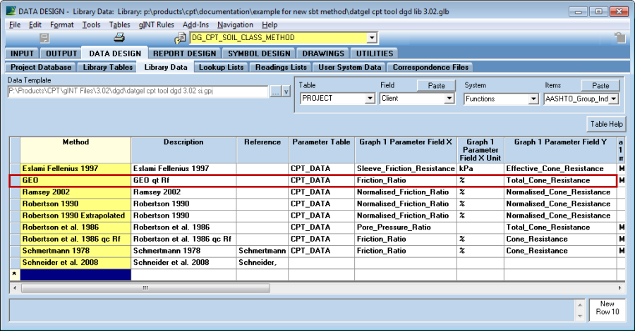 Additional methods may be defined by users in the DG_CPT* library tables. See section Creating a New Soil Behaviour Type.The CPT_DATA table allows for two methods to be defined. The methods are set on the CPT_PROJECT_PARAMETERS and the CPT_POINT_PARAMETERS tables.If the interpretation is done using 2 graphs, then the first single (not a list of numbers) result is used as the overall material classification.