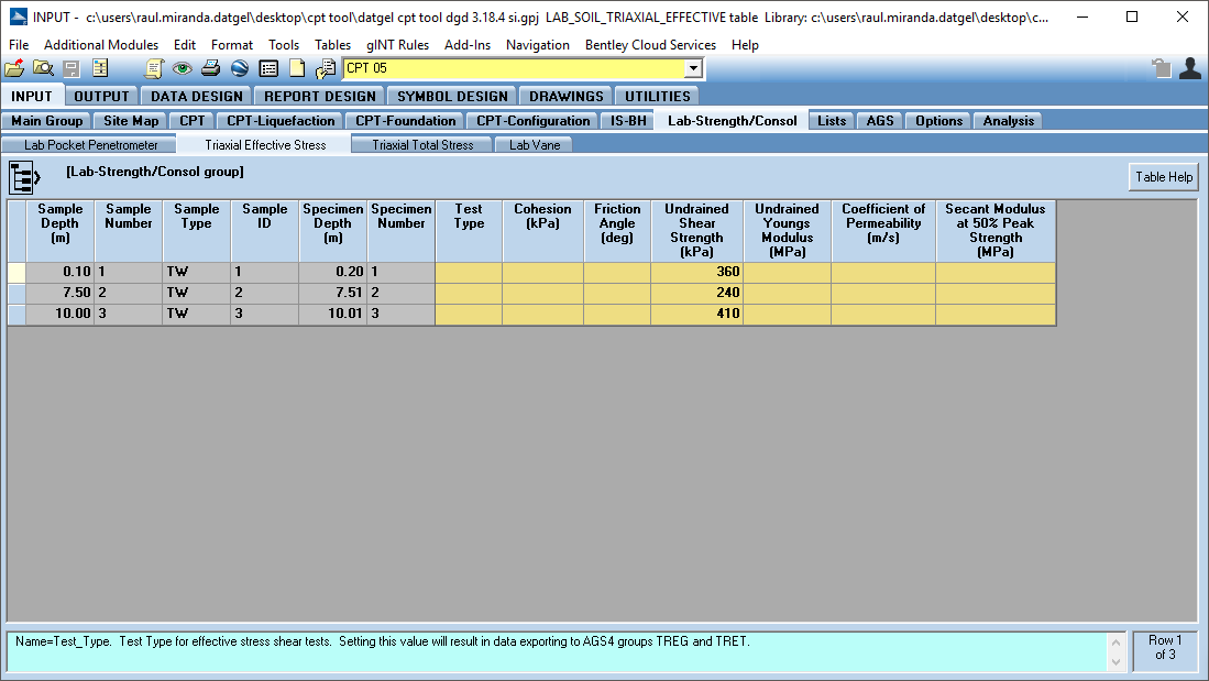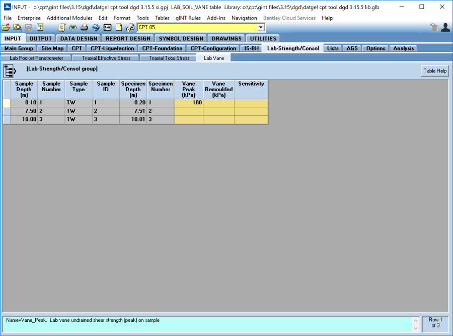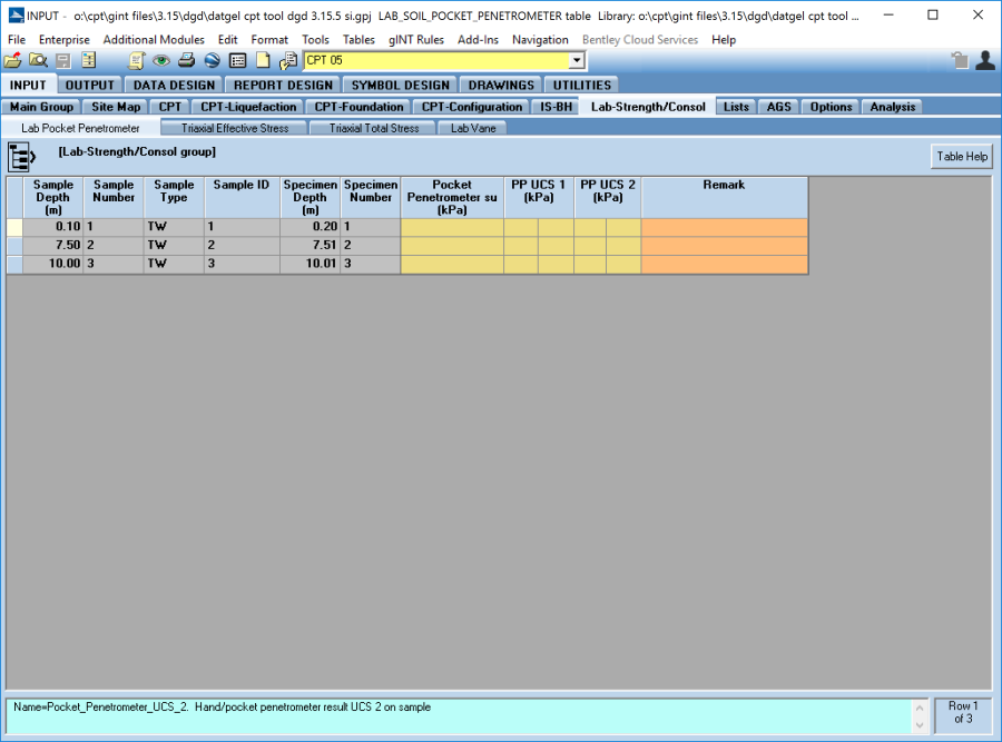 The table stores the laboratory vane and pocket penetrometer test results to be printed in graphs and logs.