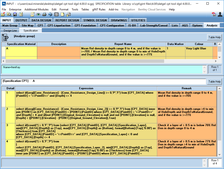These tables define the specification analysis. The results are written to CPT_Specification and CPT_Point_Specification_Detail tables. You can assign the Specification material to use on the Project_Parameter and Point_Parameter tables.