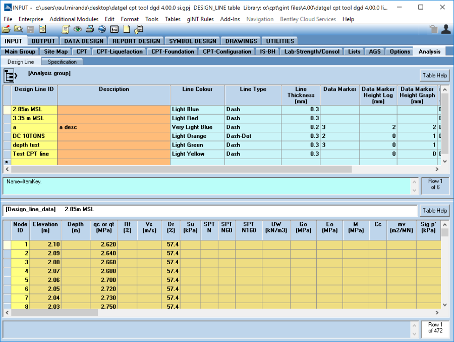 These tables define the design line for Cone Resistance and all correlations. In the case of Cone Resistance the data is written to the CPT_ Data table, and can display on log and fence reports. For correlations the data is optionally displayed on Graph reports, and not written to CPT_Data. You can assign the Design Line to use on the Project_Parameter and Point_Parameter tables.