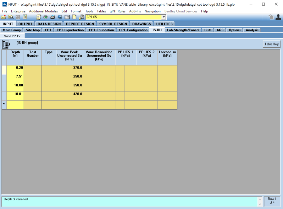 The table stores the in situ vane and pocket penetrometer test results to be printed in graphs and logs.