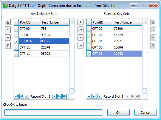 Click OK to apply the depth correction calculation. The progress bar and label on the bottom right will display the current status of the calculation process. The depth correction calculation will only be applied if the Penetration_Length field is empty for all rows for a particular CPT, and the program will skip the CPT if a Penetration_Length value is found for a CPT. A list of skipped CPTs will be displayed at the end of the calculation process.