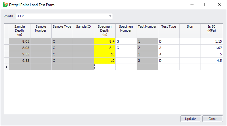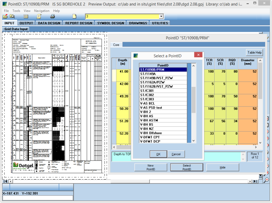 . You can then see a representation of the log on the screen and click the data area of interest. The associated tables will popup.To change the log report you are working with, go to File > Select Report for Input. To change PointID when in Graphical Data Input, double-click anywhere on the log image to bring up the grid sub form, then click Select PointID to bring up the PointID list, then select the desired PointID.