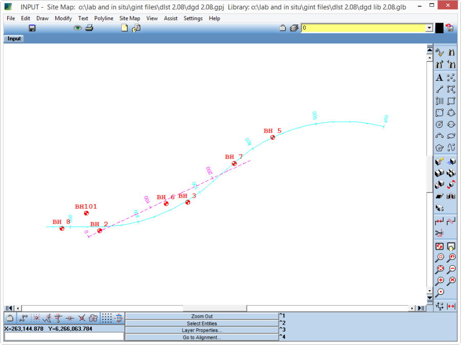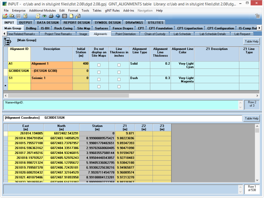The Alignment (lower) table contains the Northing and Easting values of the alignment and up to 3 optional Z values. The Station, AKA Chainage, field is read only as it is automatically populated by gINT and it records the distance along the alignment, based on the Initial_Station value in the Alignment (upper) table.