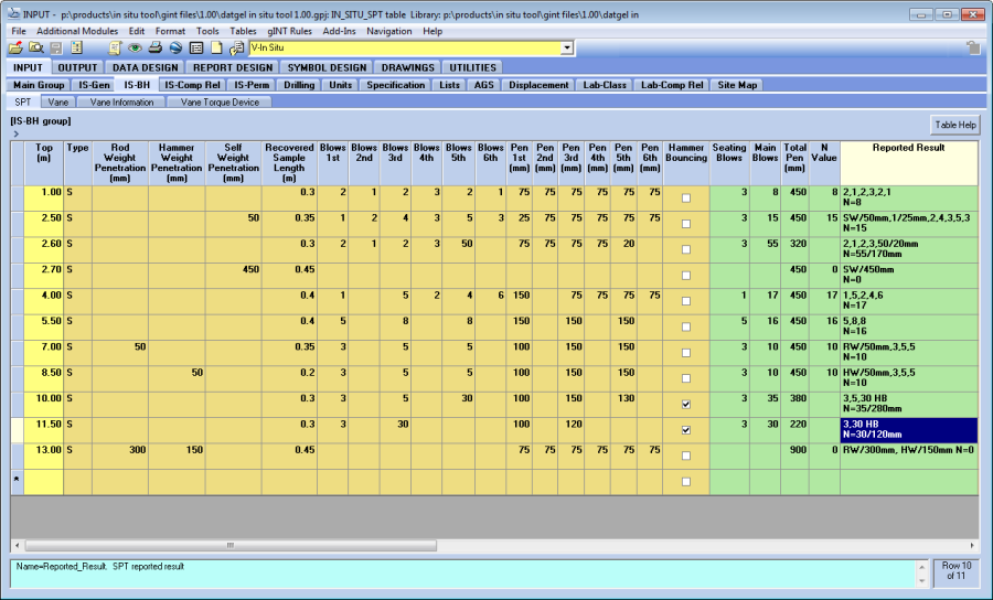 The Seating_Blows, Main_Blows, Total_Pen, N_Value (not calculated if the test does not reach 450mm) and Reported_Result will be automatically calculated when you change table or click save (Ctrl+S).