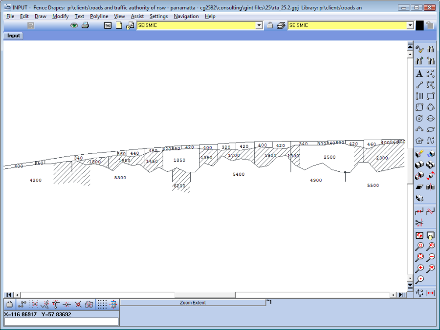 Fence Drapes are vertical planes in 3D space, hence when viewed in plan appear as a polyline. They are commonly used to store a geophysical interpretation or a vertical profile drawing along a linear structure, and can be displayed as a projected onto a 2D Fence output. They are stored in the Input | Fence Drapes group and there is no limitation on the number of drapes that can be stored in a project file.