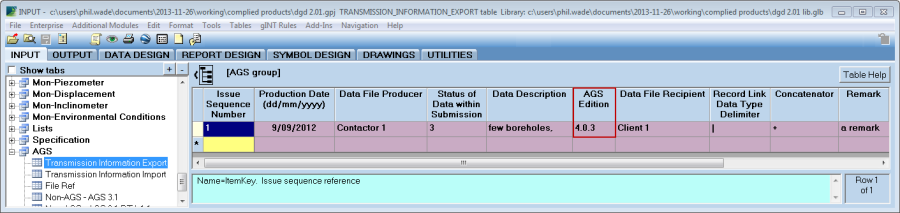 Before exporting to AGS the field AGS_Edition, found on the Transmission_Information_Export table, must be set. Refer to table AGS Edition Value.
