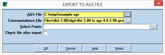 To export your data to an AGS file, select the File > AGS Files > Export to AGS File menu item in the Input application. That will export the currently active project. The following dialog appears: