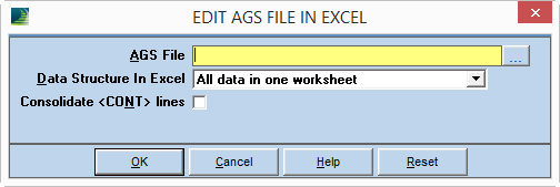 In the Input application, select File > AGS Files > Edit AGS File in Excel…. This option is not available if you do not have Excel installed. On invoking the command, the following dialog appears: