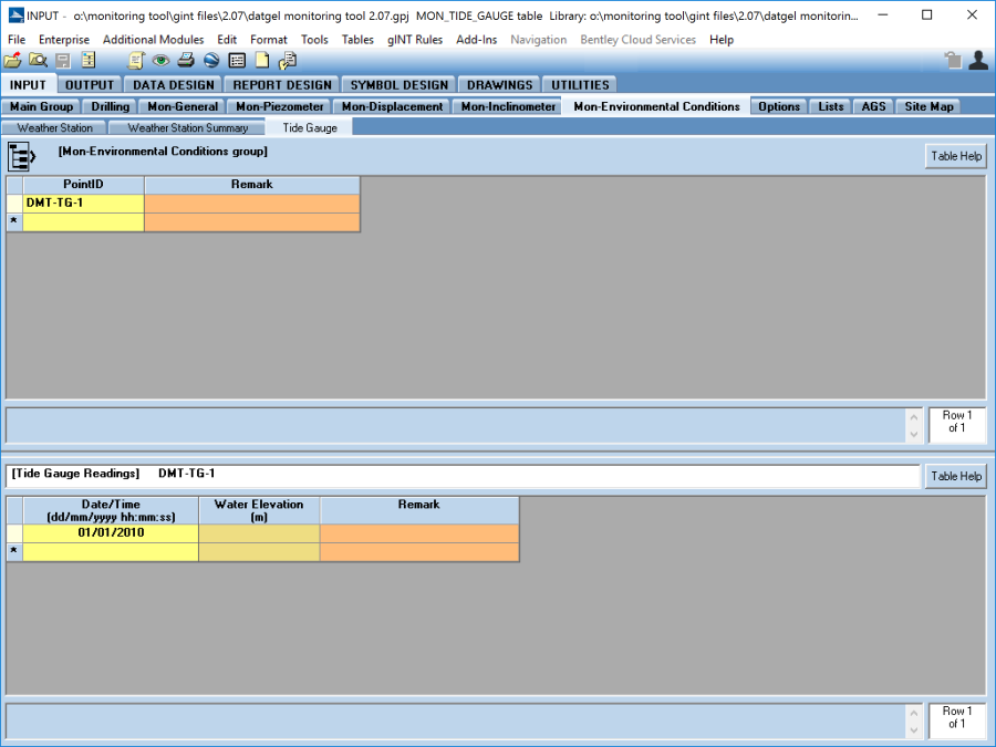 The Tide_Gauge table is in the Mon_Environmental_Conditions table. The PointID is selected in the Tide_Gauge (upper) table. In the Tide_Gauge (below) table the keyset for this table is PointID, Date/Time. The Water_Elevation field is used to store the water elevation.