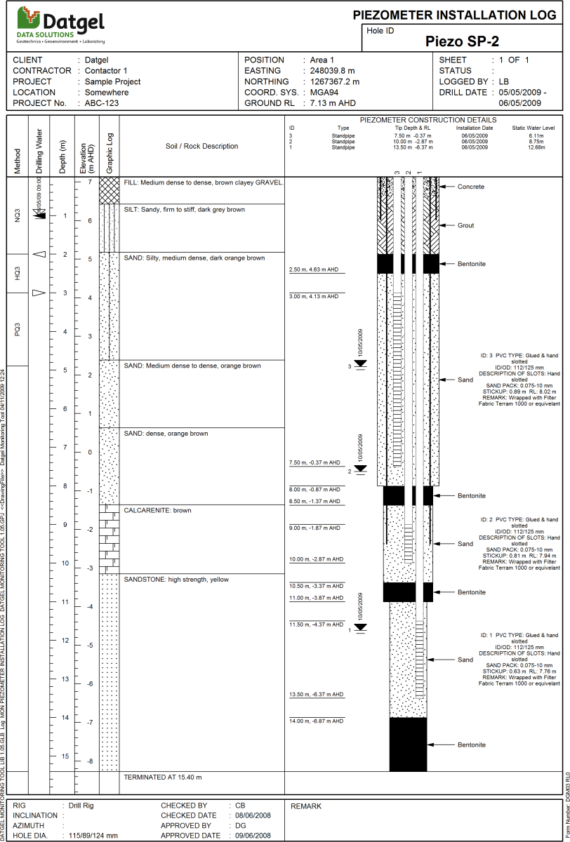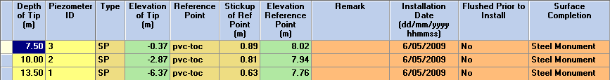 The following example describes how to record 3 individual slotted standpipe piezometers installed within one borehole, using the data displayed in the example screenshots below. The example output of the installation is then shown in Example Piezometer Installation Report.
