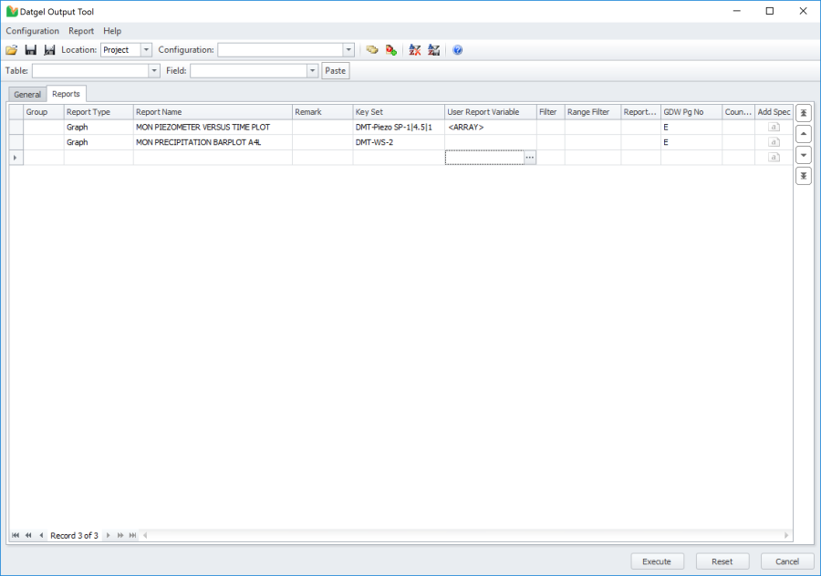 Datgel Output tool allows the user to print Rainfall Data for a different PointID by populating the field Key Set in Reports tab.