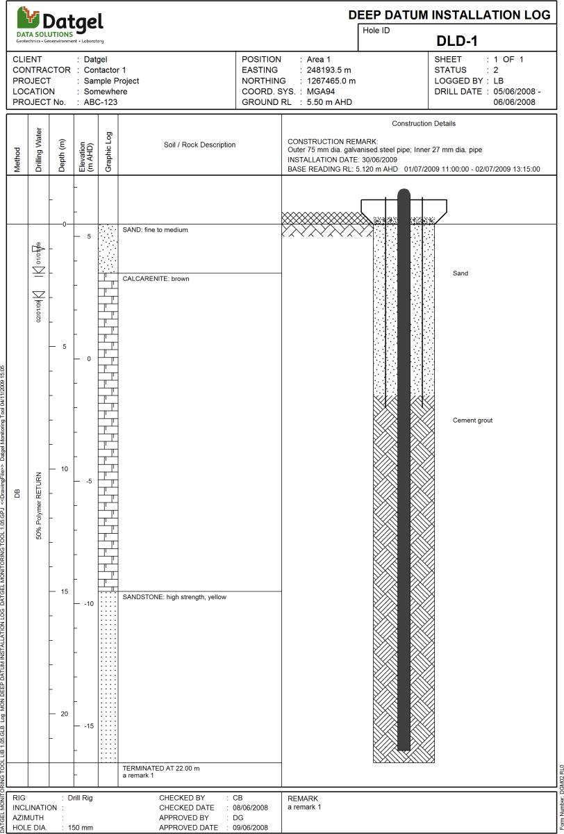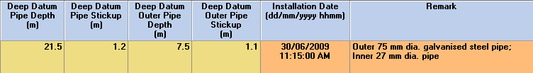 The following example describes how to record a deep datum installation, using the data displayed in the example screenshots below. The example output of the installation is then shown in Example Deep Datum Installation Report.