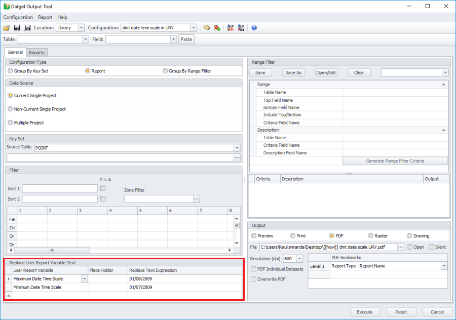 The Datgel Output Tool allows the user to set the Date Time Scale on demand. This action can be done from the Reports table, by setting up the User Report Variables Maximum_Date_Time_Scale and Minimum_Date_Time_Scale. If the user needs to to apply the same values to all reports, this action can be done in the General tab, by setting up the Replace User Variable Text.