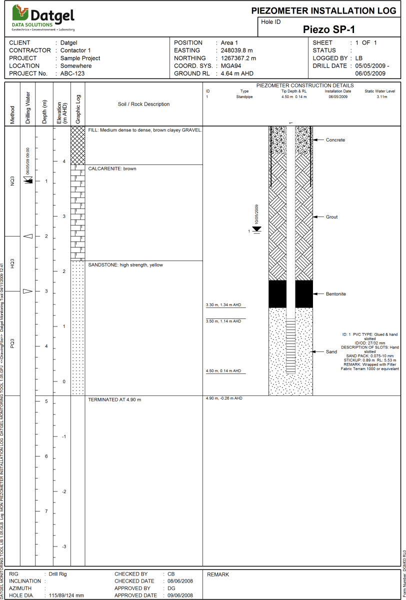 The following example describes how to record 1 slotted standpipe piezometer installed within a borehole, using the data displayed in the example screenshots below. The example output of the installation is then shown in Example Piezometer Installation Report.