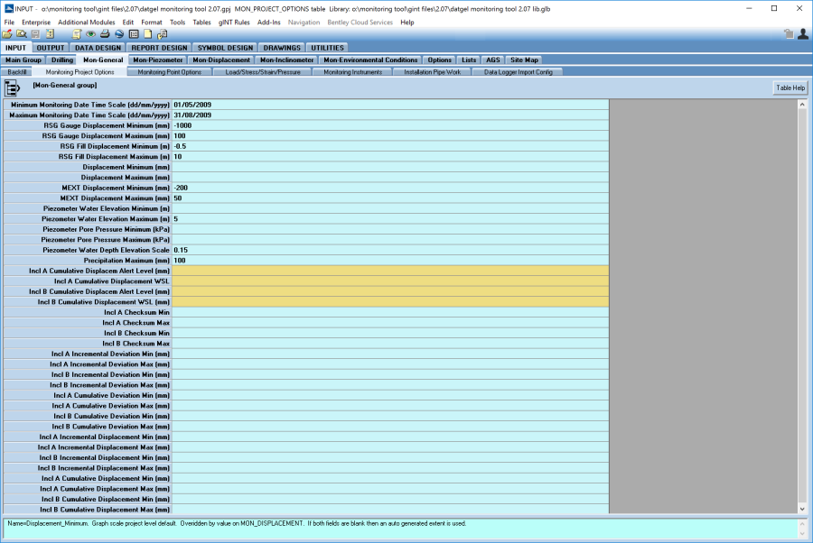 To print both Piezometer and Rainfall data in the same date range, this information can be defined in the fields Minimum_Monitoring_Date_Time_Scale and Maximum_Monitoring_Date_Time_Scale in Mon_General_Group - Monitoring_Project_Options Table.