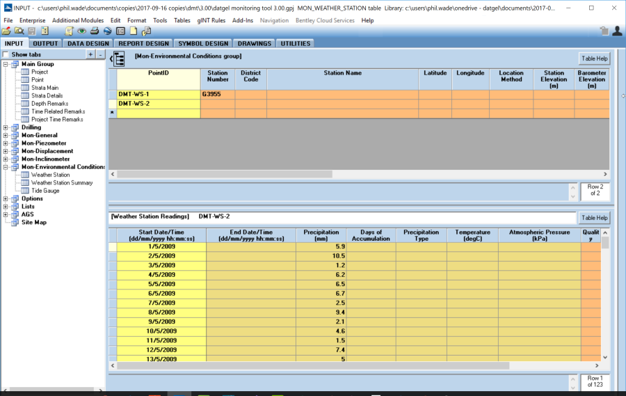 A Gint Script file is provided with the Datgel Monitoring Tool files (mon hydrograph a4l and precipitation.gsc). The Script file allows the user to print the rainfall data on a piezometer graph manually. Then, the Script file should be modified according the project data. It can be done using either a text editor as Note Pad or Note Pad++ or in gINT>Output tab> 'Click on Script Icon' > Edit Script.