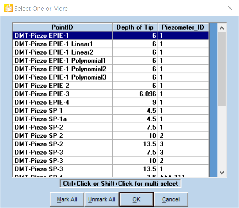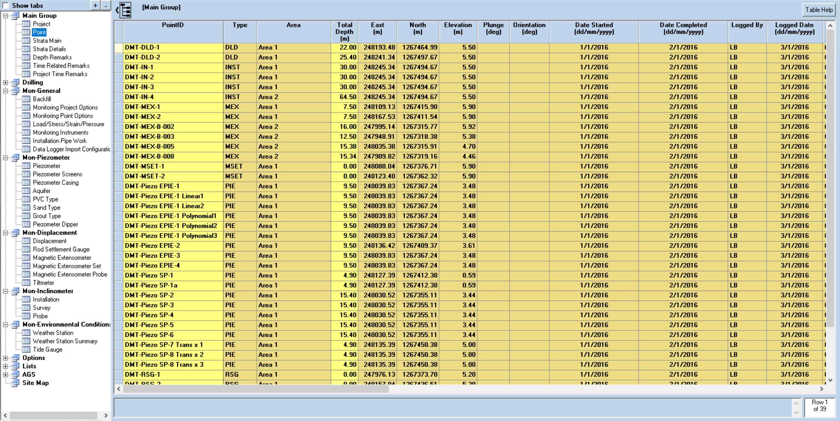 Main Group | Point table stores the general information related to the Borehole (Hole depth, coordinates, elevation, etc). Each row is a borehole.