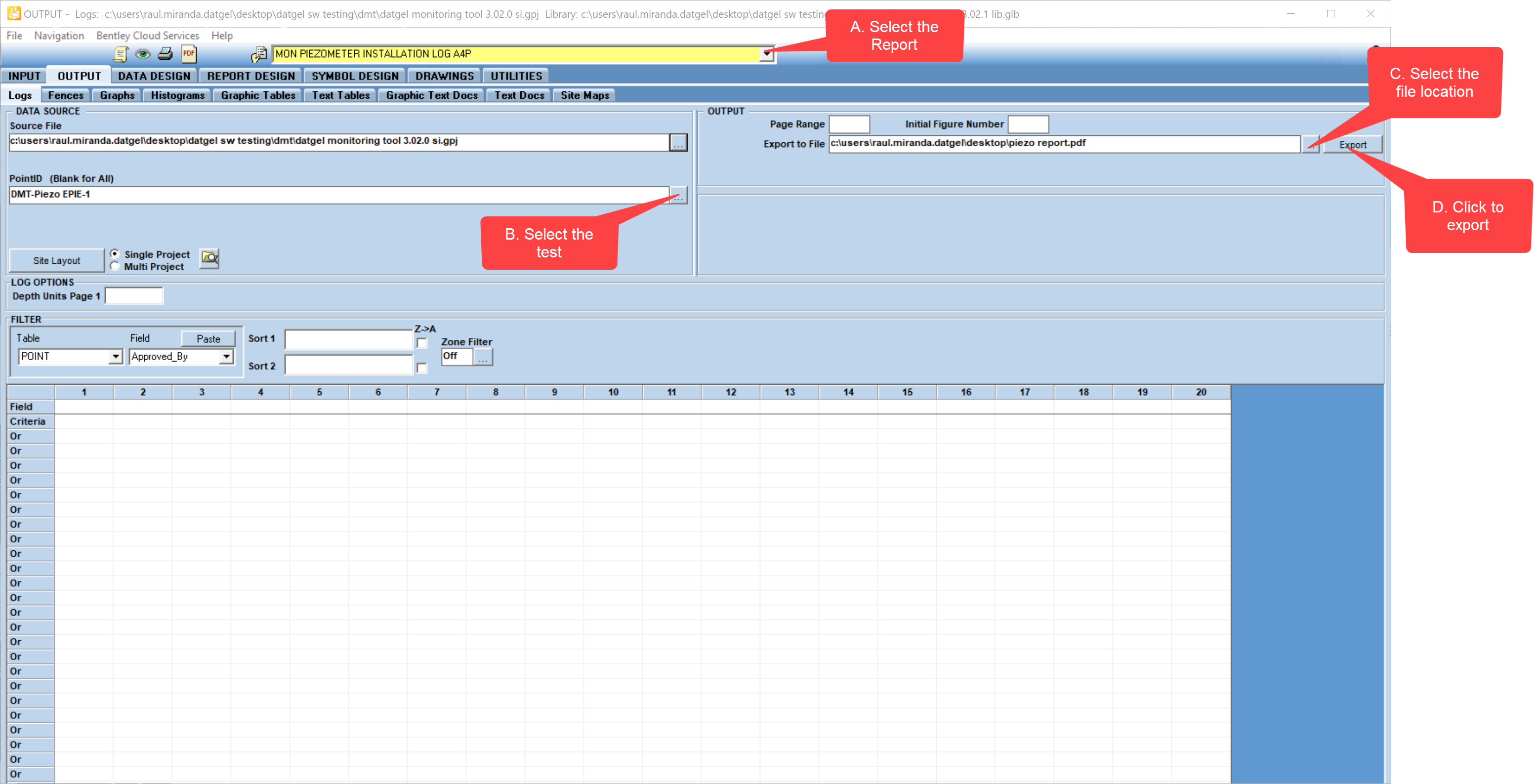 - Select the MON PIEZOMETER INSTALLATION LOG A4P report from the yellow drop-down list.
