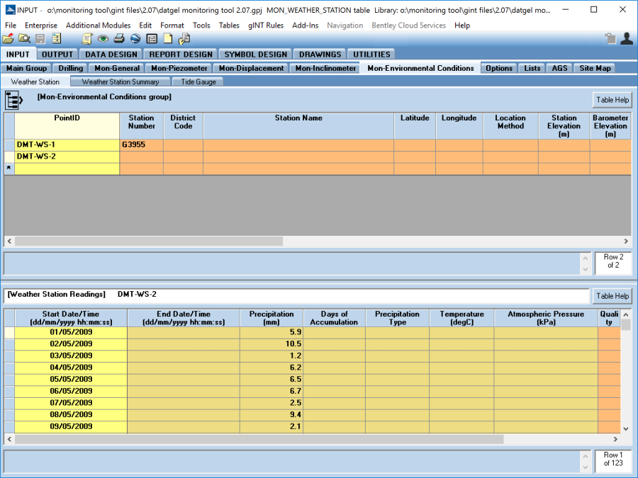 The Weather_ Station_Readings (lower) table stores the readings of Precipitation, Days_of_Accumulation, Precipitation_Type, Temperature and Atmospheric_Pressure between a Start and End time period.