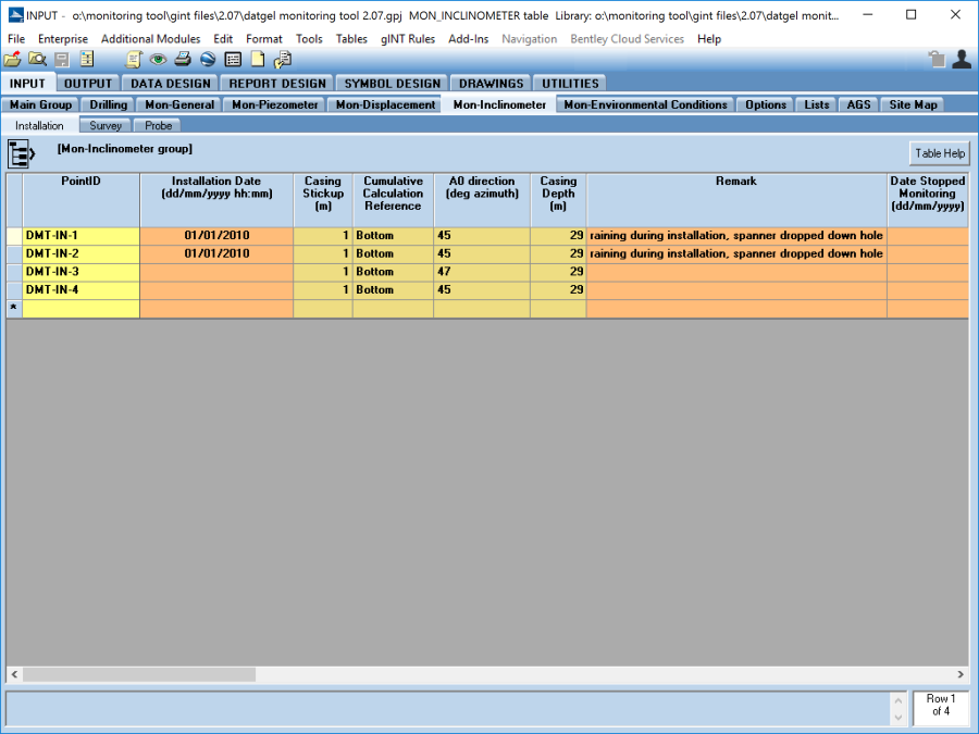 The Installation table is used to store the details of the inclinometer installation for a PointID. Details of the inclinometer installation can be entered in this table.