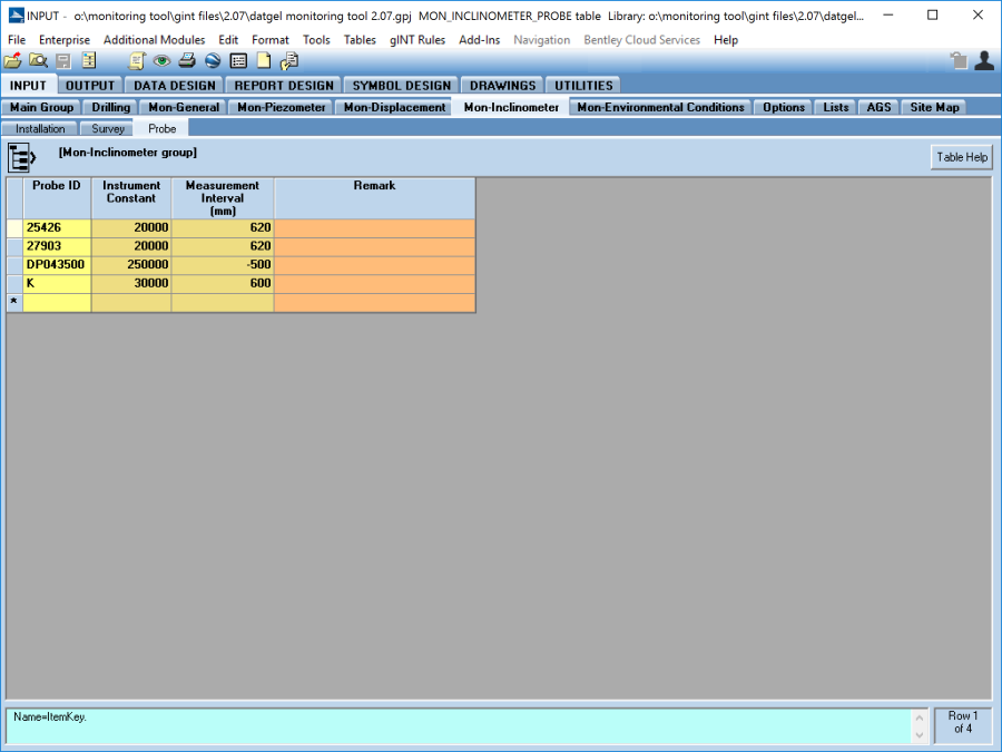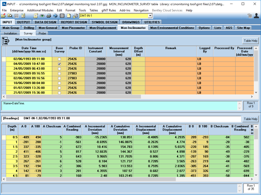 The Inclinometer table stores and calculates data related to Inclinometer tests. The database structure allows multiple readings for one PointID, where each measure has a unique PointID – Date Time combination.
