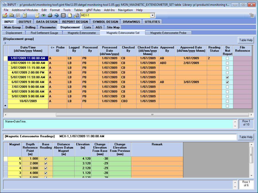 The general magnetic extensometer monitoring readings are recorded on the Magnetic_Extensometer_Set (upper) table by entering the date and time when the monitoring occurred in the Date Time field and the associated metadata in the remaining fields.