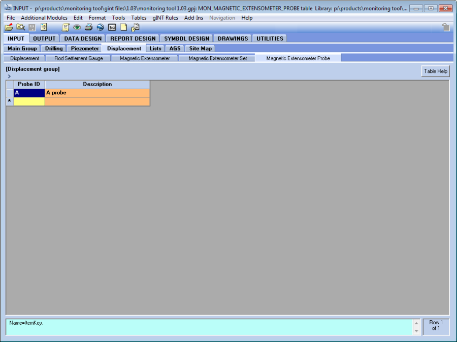 The Magnetic_Extensometer_Probe table is used to store the relevant details of each type of magnetic extensometer probe used to monitor the installation. The Description given to the Probe_ID can then be picked on the Magnetic_Extensometer_Set table.