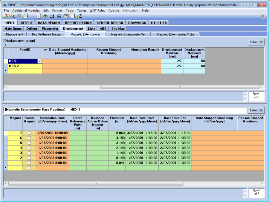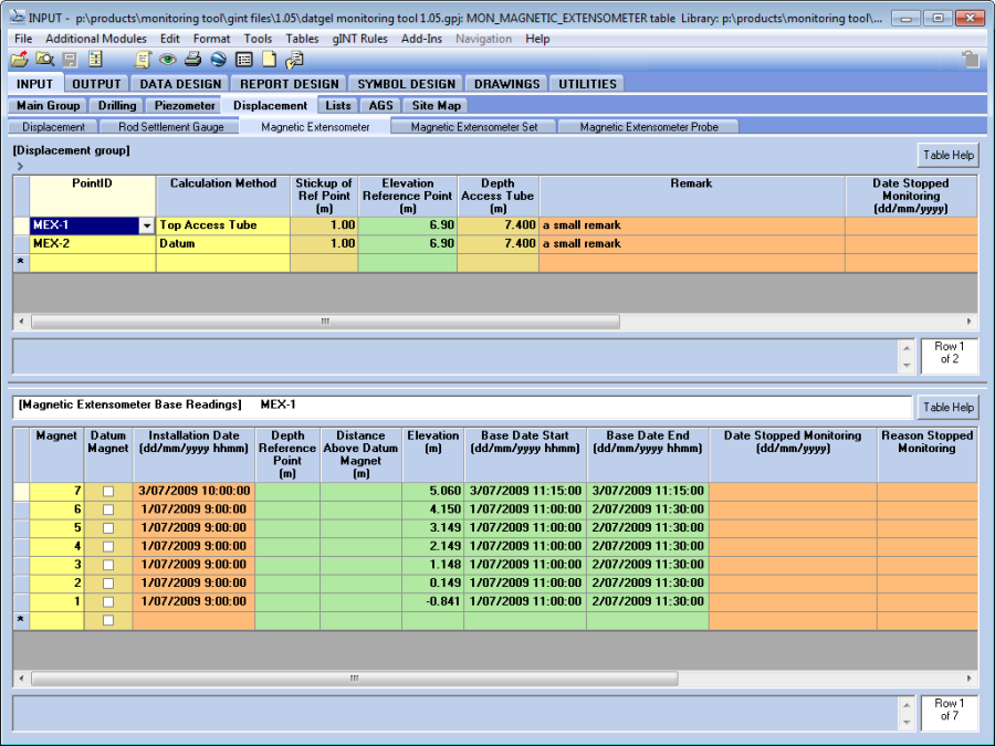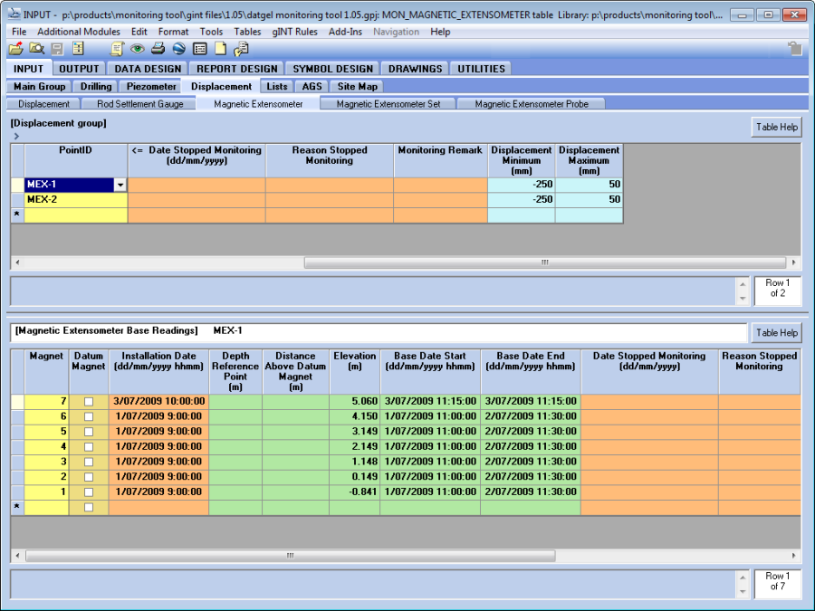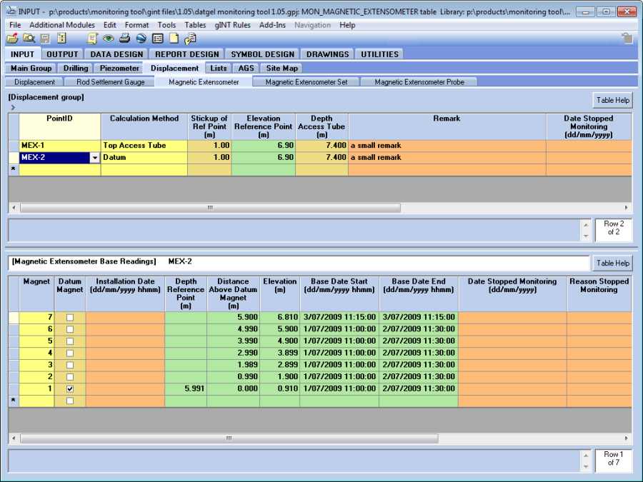 The reading for each magnet at the time when the monitoring occurred is recorded on the Magnetic_Extensometer_Set (lower) table by entering the recorded depth to each magnet in the Depth_Reference_Point field.