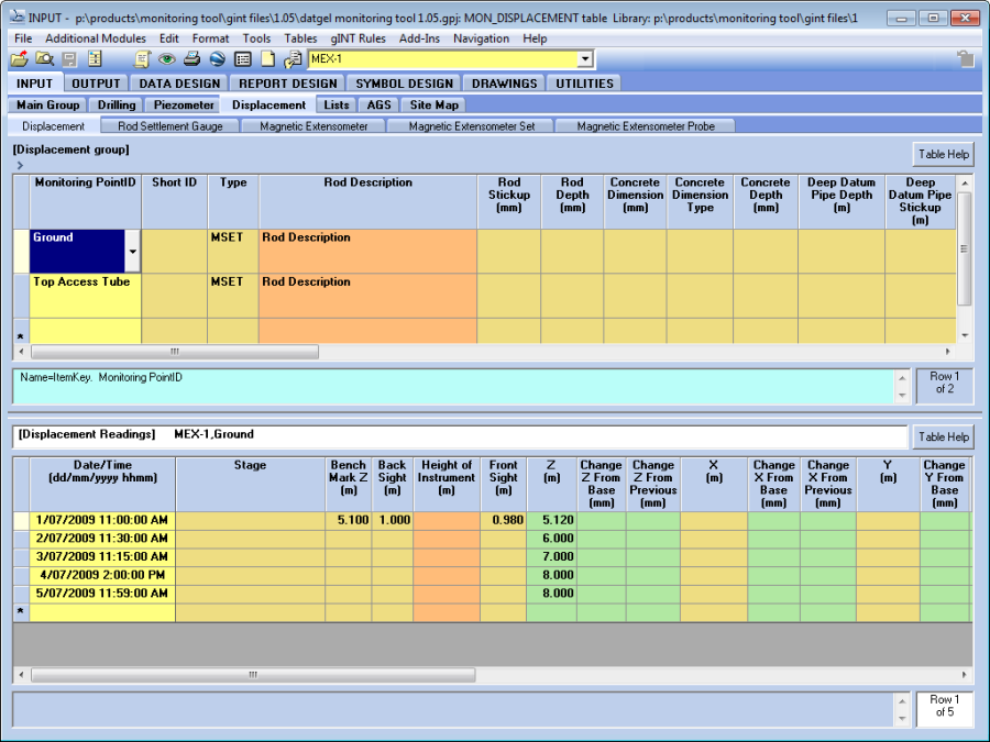 If the Top Access Tube option in the Calculation_Method field on the Magnetic_Extensometer (upper) table is selected then the selected Monitoring_Point_ID on the Displacement (upper) table for the PointID must be Top Access Tube. The Type would be MSET. The survey data is then entered on the Displacement (lower) table.