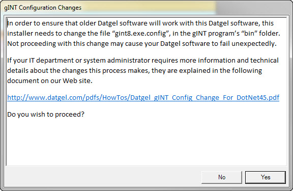 The software makes a backup copy of the existing gINT configuration file and inserts the changes Datgel software needs.