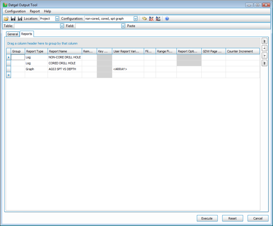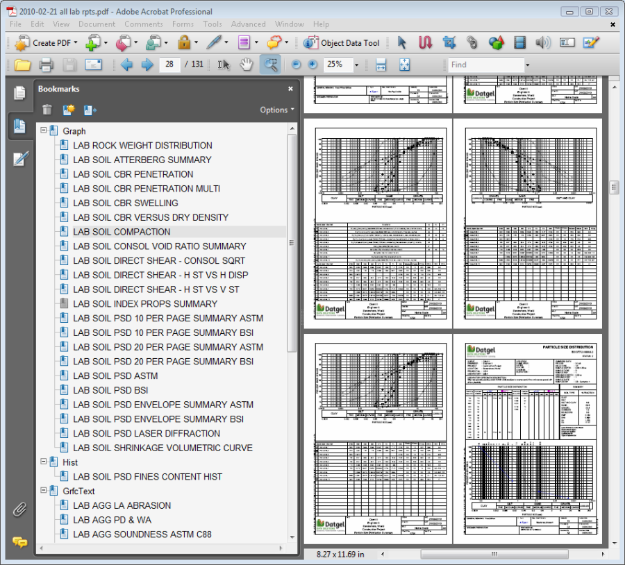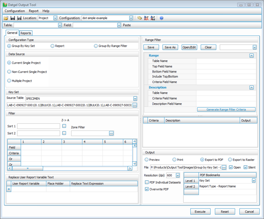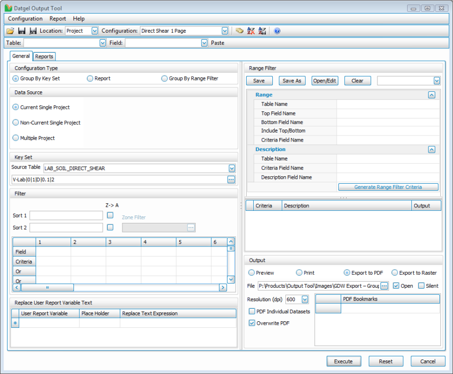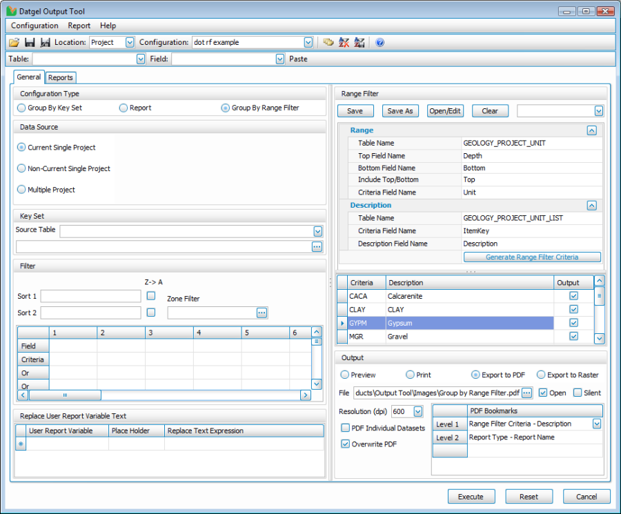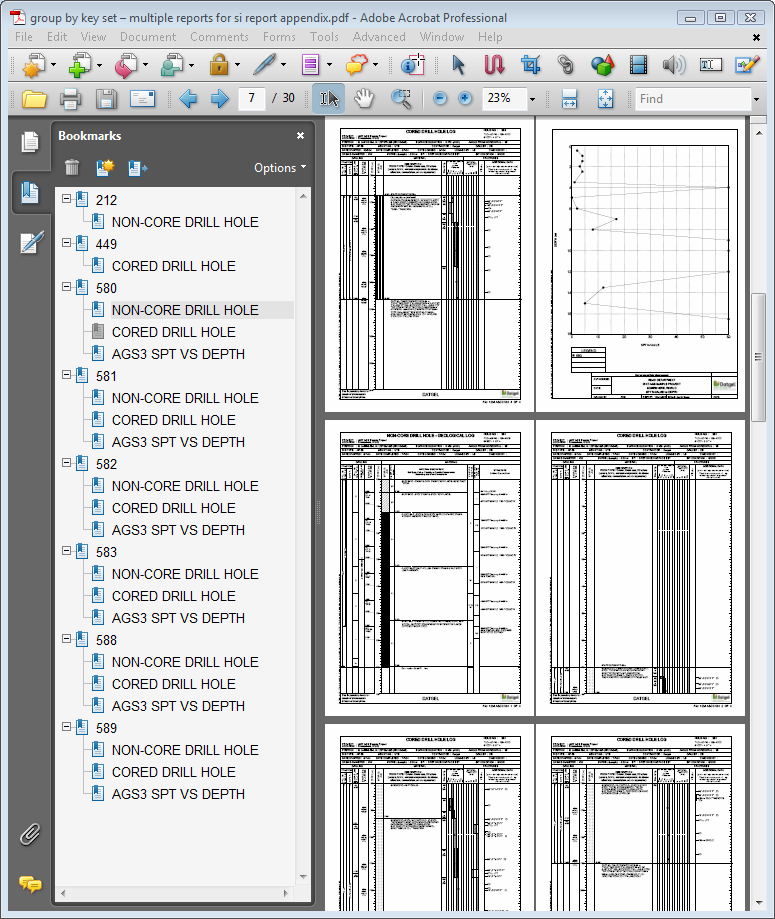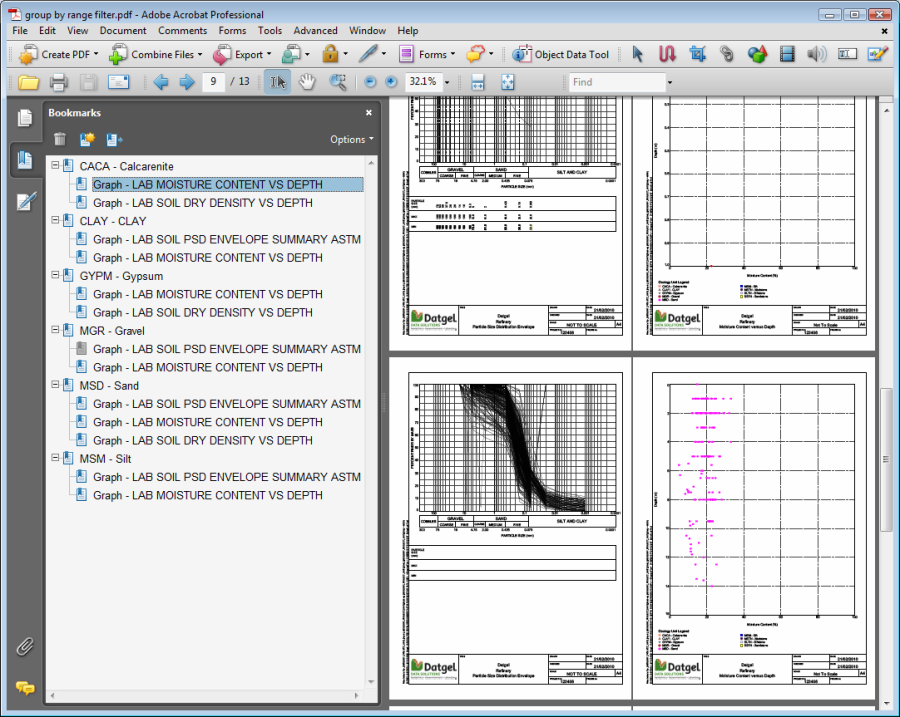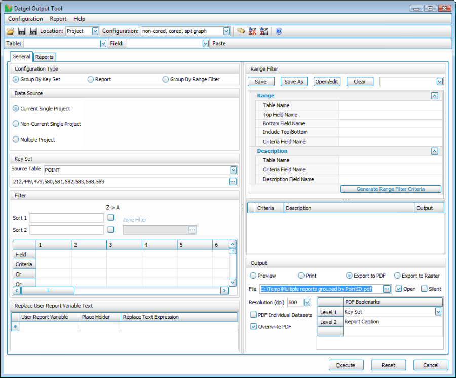 This example exports a PDF of all reports in the Datgel Lab Tool for a PointID grouped by Report.
