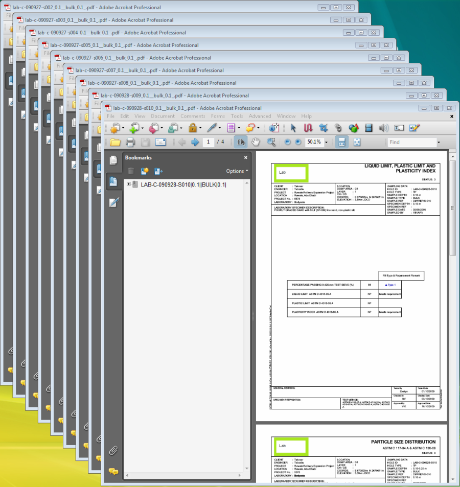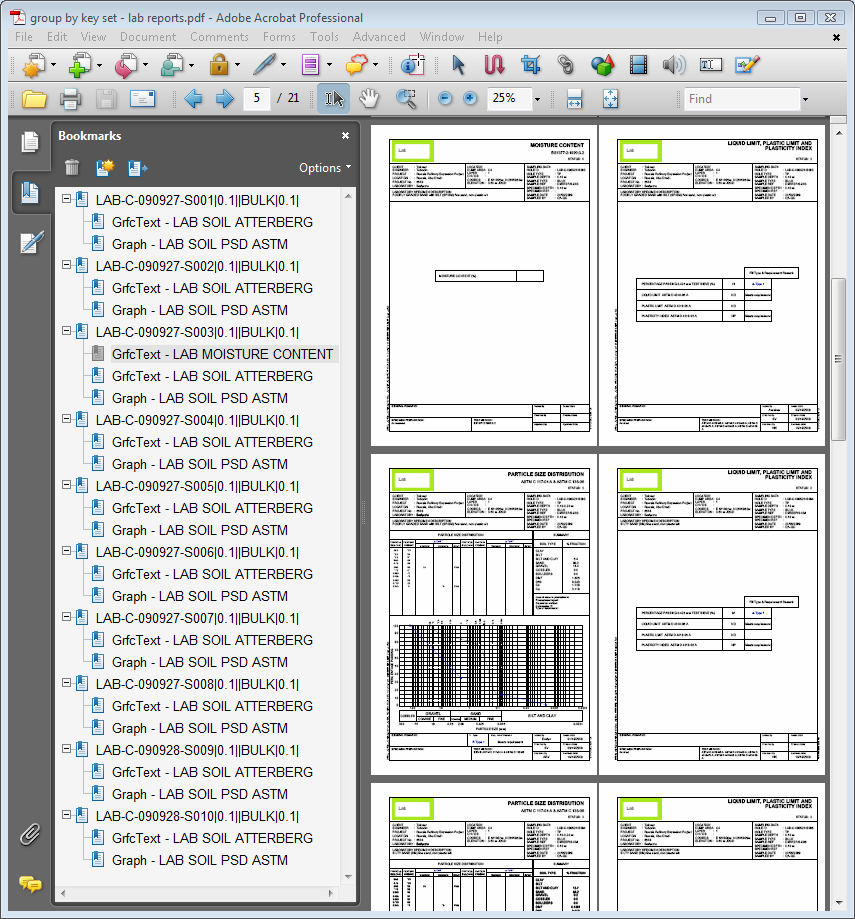 This example exports a PDF of lab reports grouped by Key Set. It results in a bookmark for each specimen Key Set with 6 lab report sheet pages under each book mark. This data set didn't have data for all graph reports.