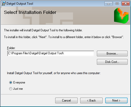 Alternatively choose I Do Not Agree and click Cancel if you disagree with the license agreement. The installation will stop and exit. - On the Select Installation Folder dialog, either accept the default folder (recommended) or select Browse to specify the folder where you want to install the Output Tool. Leave Everyone bulleted to indicate that anyone logged onto the PC can use the Output Tool. Click Next when ready.