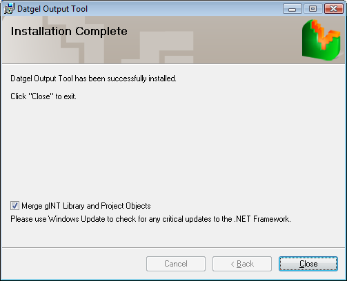 - When the Installation Complete dialog is displayed you have the choice to initiate the merging of gINT library objects after you click close by checking the Merge gINT Library and Project Objects check box. Click Close.