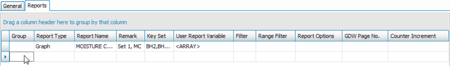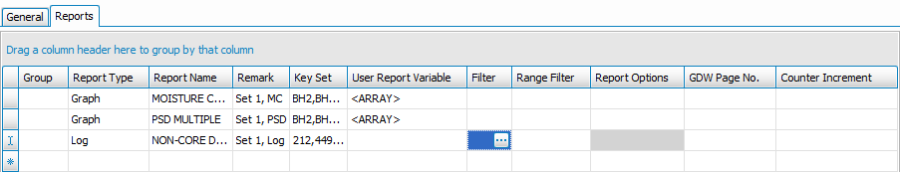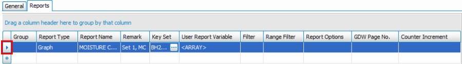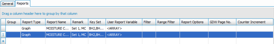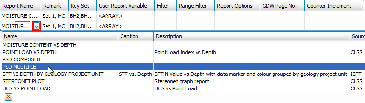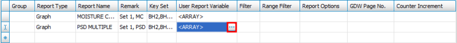 - We could now repeat Steps 11 through to 18 to add similar details for the PSD MULTIPLE Graph report. Instead, we can copy the details for the MOISTURE CONTENT VS DEPTH Graph report. To do this, left click on the row button to highlight the row.