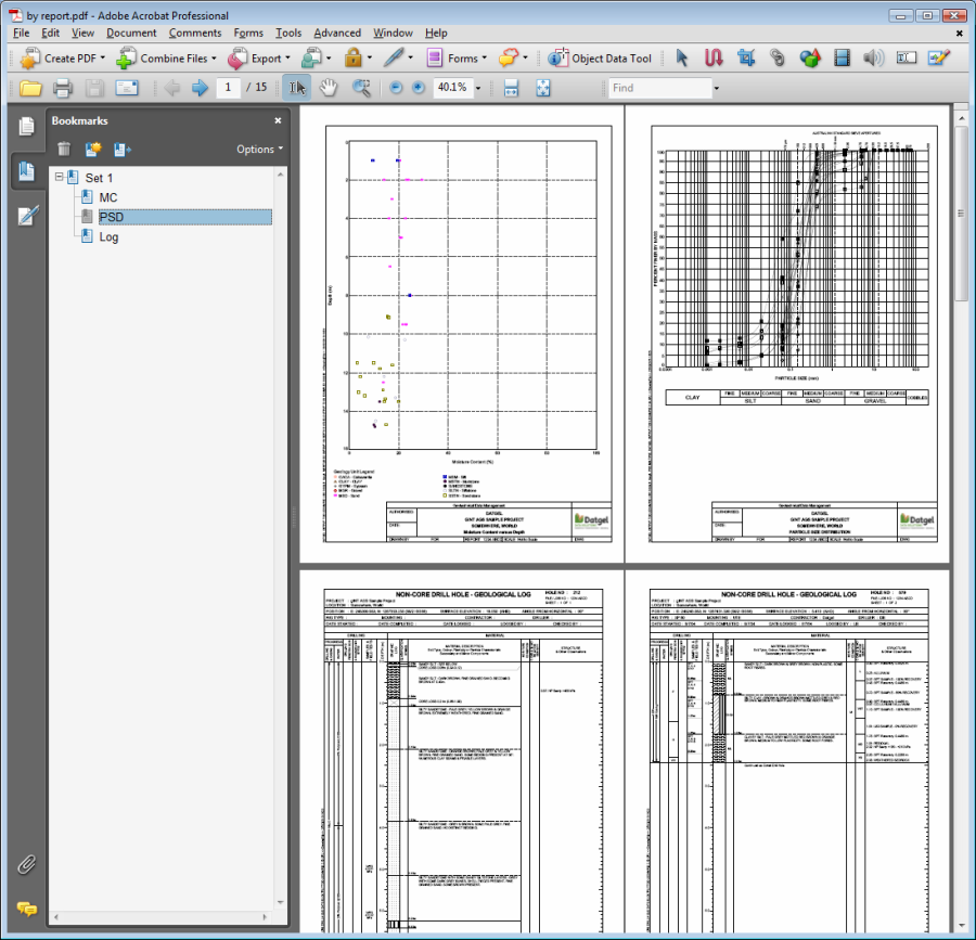 This example shows the batch output of a moisture content graph, a PSD graph and a non-cored log grouped by Report Name.