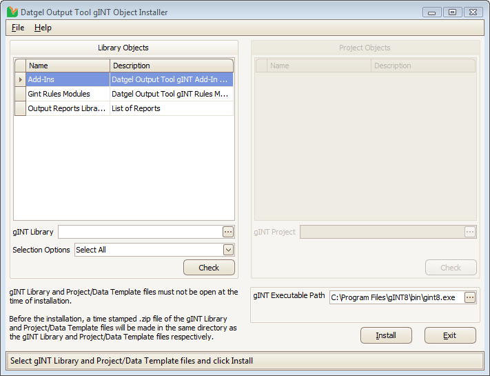 The gINT Object Installer can also be called from Windows Start > All Programs > Datgel > Datgel Output Tool gINT Object Installer.